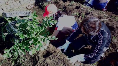 土をひっくり返して空気を入れ、来年もおいしいお米ができるようにみんなで力を合わせて一生懸命取り組みました。