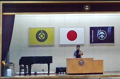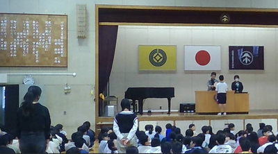 学年全員で声をそろえて全校の前で