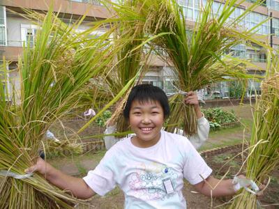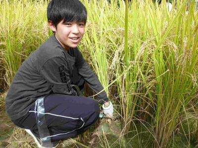 5月の田起こしから始まった稲がいよいよ収穫の時期となり、3日に稲刈りを行いました。子どもたちは、初めて体験する子が多く、わくわくした様子で稲刈りを行いました。稲を乾燥し、稲とお米を分ける脱穀を行えば、いよいよお米が食べられます。実食まであと少し5年生は頑張ります。