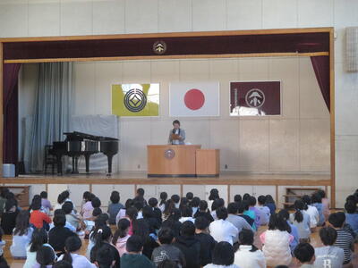 パクモリ食育委員会の児童が朝会で発表を行いました。