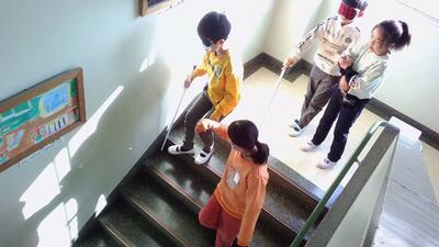 今日は、学習の一環として白杖体験を行いました。アイマスクをして杖をつき、歩くことの難しさや、不安になる気持ちなど理解しながら体験をしました。