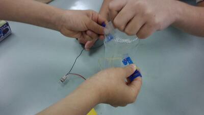 缶やペットボトルを使って実験し、「電気を通す物」と「電気を通さない物」について調べました。