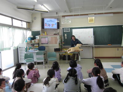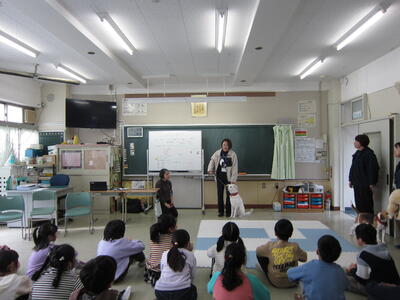 川口市保健所の方、動物愛護団体の方、三匹の活動犬に来校いただき授業を行いました。