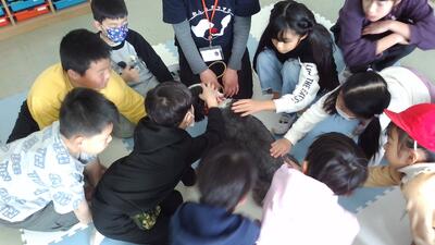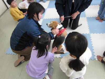 その後、活動犬とのふれあいました。子供たちは、そっと手を差し出し、活動犬とのふれあいを楽しんでいました。