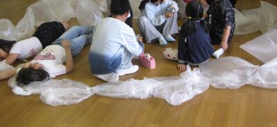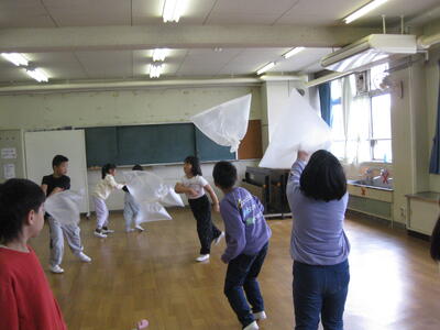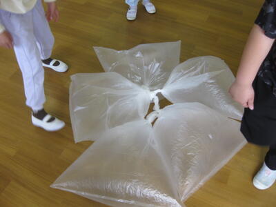 3年生 図工「ふわふわ空気 つんでつなげて」 投稿: 情報担当 (16:42) 3年生の図工の授業で、「ふわふわ空気 つんでつなげて」を行いました。 大きなビニール袋に空気を入れて、風船のように膨らませます。 ふわふわした感触を、触ったり、上に飛ばしたりして楽しんでいました。 友達と袋をつなげて、お花のパラシュートを作って飛ばしたり、温泉を作ってみんなでくつろいだり、いろんなことに挑戦しながら活動することができました。
